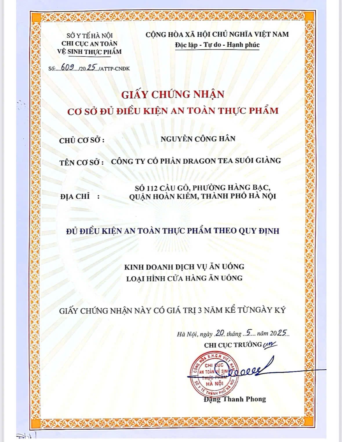 Được Chi cục An toàn vệ sinh thực phẩm – Sở Y tế Hà Nội cấp ngày 20/5/2025, chứng nhận Công ty Cổ phần Dragon Tea Suối Giàng đủ điều kiện kinh doanh dịch vụ ăn uống theo quy định pháp luật.